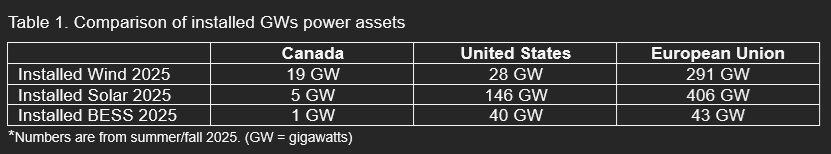 The U.S. dwarfs Canada in already installed renewable energy capacity and is expected to continue outpacing Canada in new development. The U.S. is similarly small compared to the EU, which is outmatched by development in China. Canada is competing for manufacturing dollars in this global landscape.